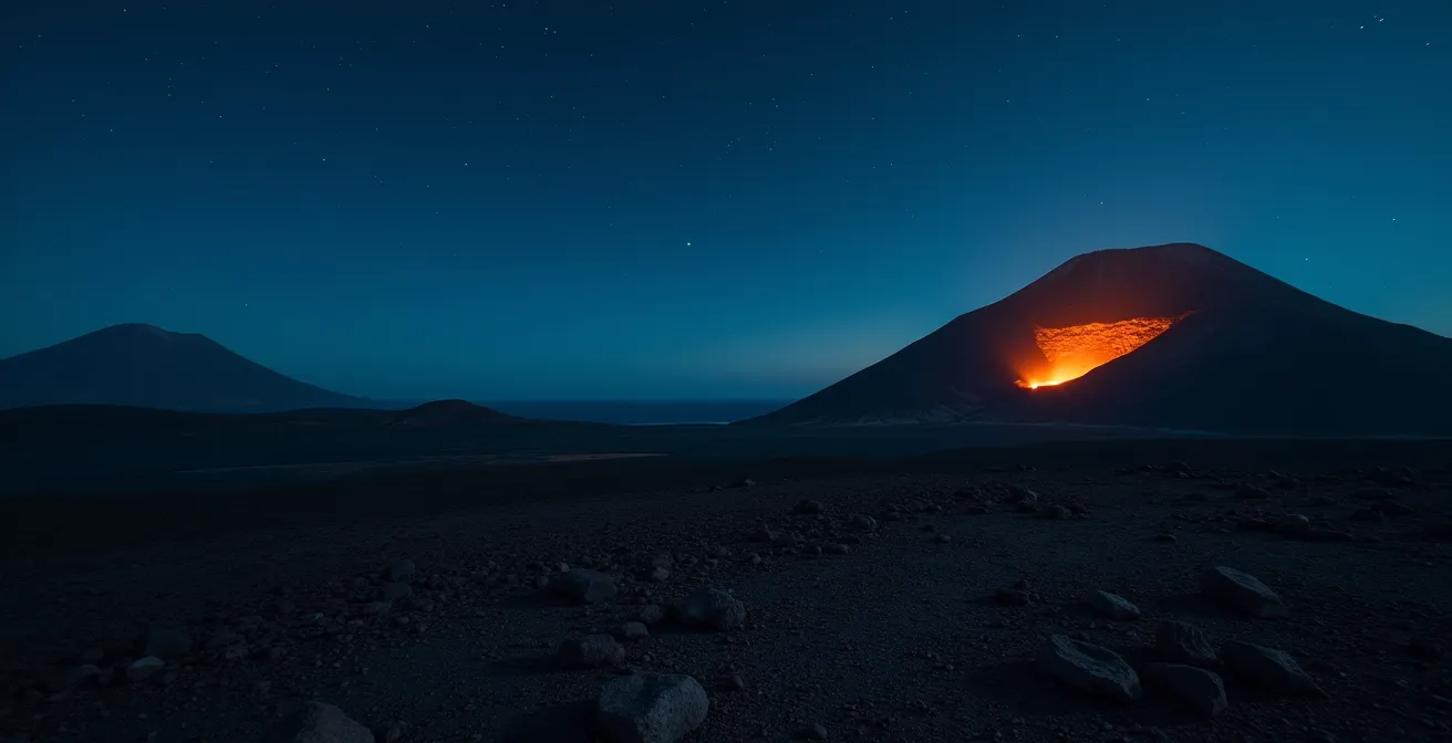 Photographier une éruption volcanique de nuit depuis la Plaine des Sables ou le Pas de Bellecombe est un défi technique et artistique. La difficulté majeure réside dans la gestion d’un contraste lumineux extrême : la lueur intense de la lave face à l’obscurité quasi totale du paysage. Plutôt que de vous reposer sur des filtres, qui peuvent dénaturer l’ambiance, la clé est de maîtriser quelques techniques de prise de vue et de composition pour capturer la magie de l’instant de la manière la plus authentique possible.
